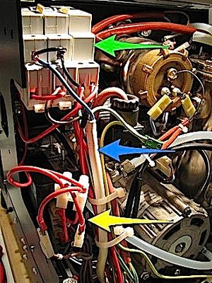 Die permanente Phase und den Nulleiter kann man ebenfalls mit Y-Anschlüssen abgreifen, am Einfachsten in der unteren Steckerleiste. Dies wurde in der Dokumentation der Vivaldi-Umrüstung für Zeitschaltuhr-Betrieb bereits gezeigt - diese Schaltung war im vorliegenden Fall schon realisiert, sodass die beiden MV-Steuerrelais' nur mit dem Einschaltwischer der Zeitschaltuhrsteuerung verbunden werden mussten.